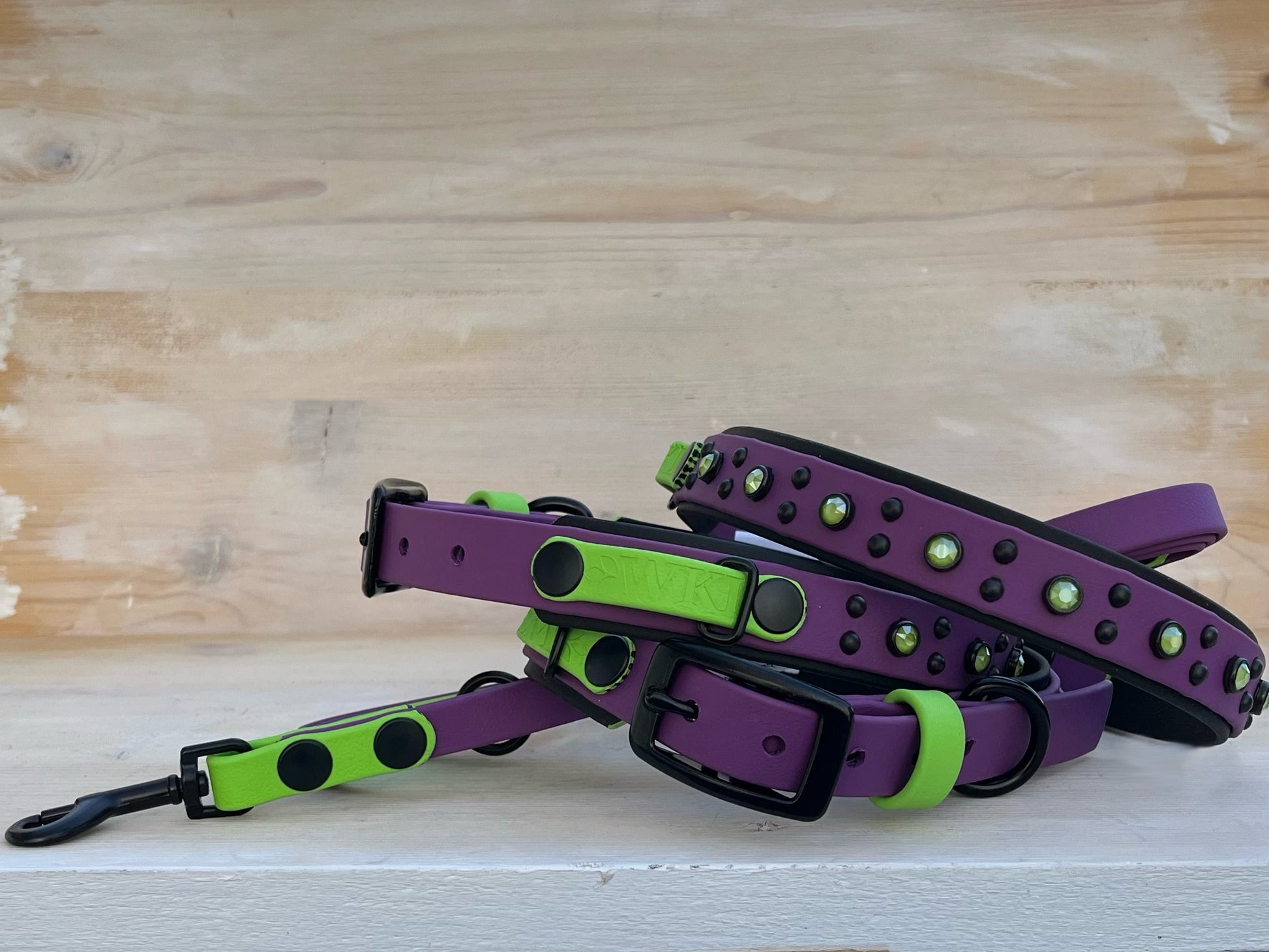 Features Grape, Black, and Lime Biothane®, with black hardware and studs, and matching Lime crystals.