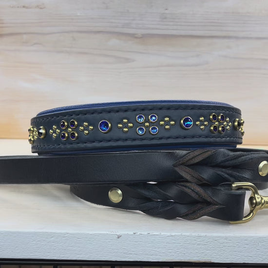 Leash: 3/4" wide x 4' long. Has matching embellishments at snap end.