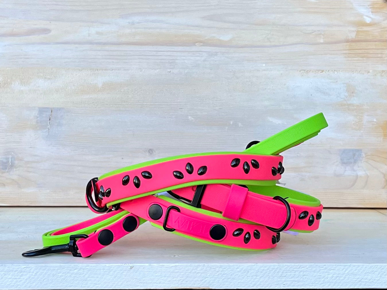 Suitable for Swamp Monsters, this basic collar will look (and smell!!) great on any adventure. Features Neon Pink and Lime Green, with Barbie Pink accents, and black hardware.